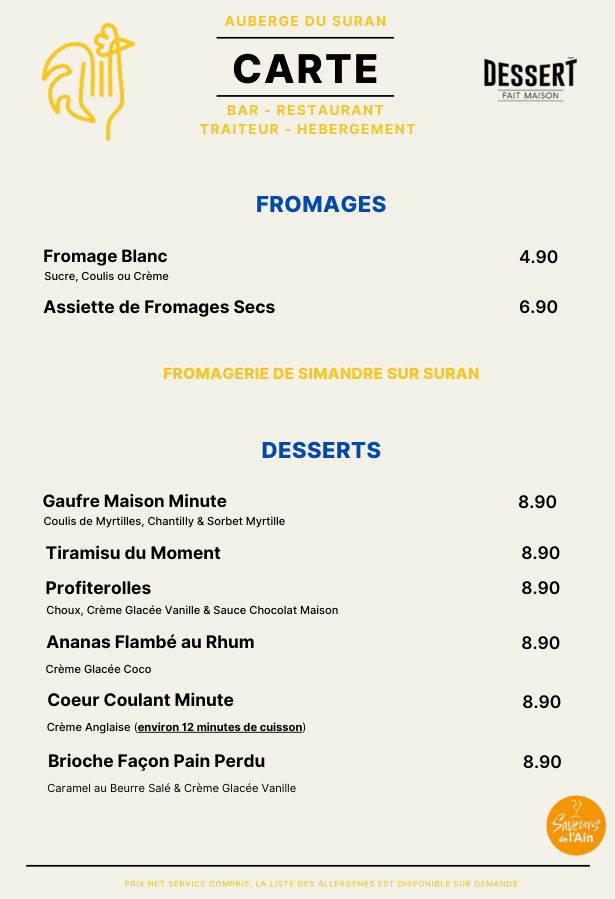 Pour les desserts maison, consulter l'ardoise (en fonction des saisons, des approvisionnements et des inspirations de la Pâtissière !)